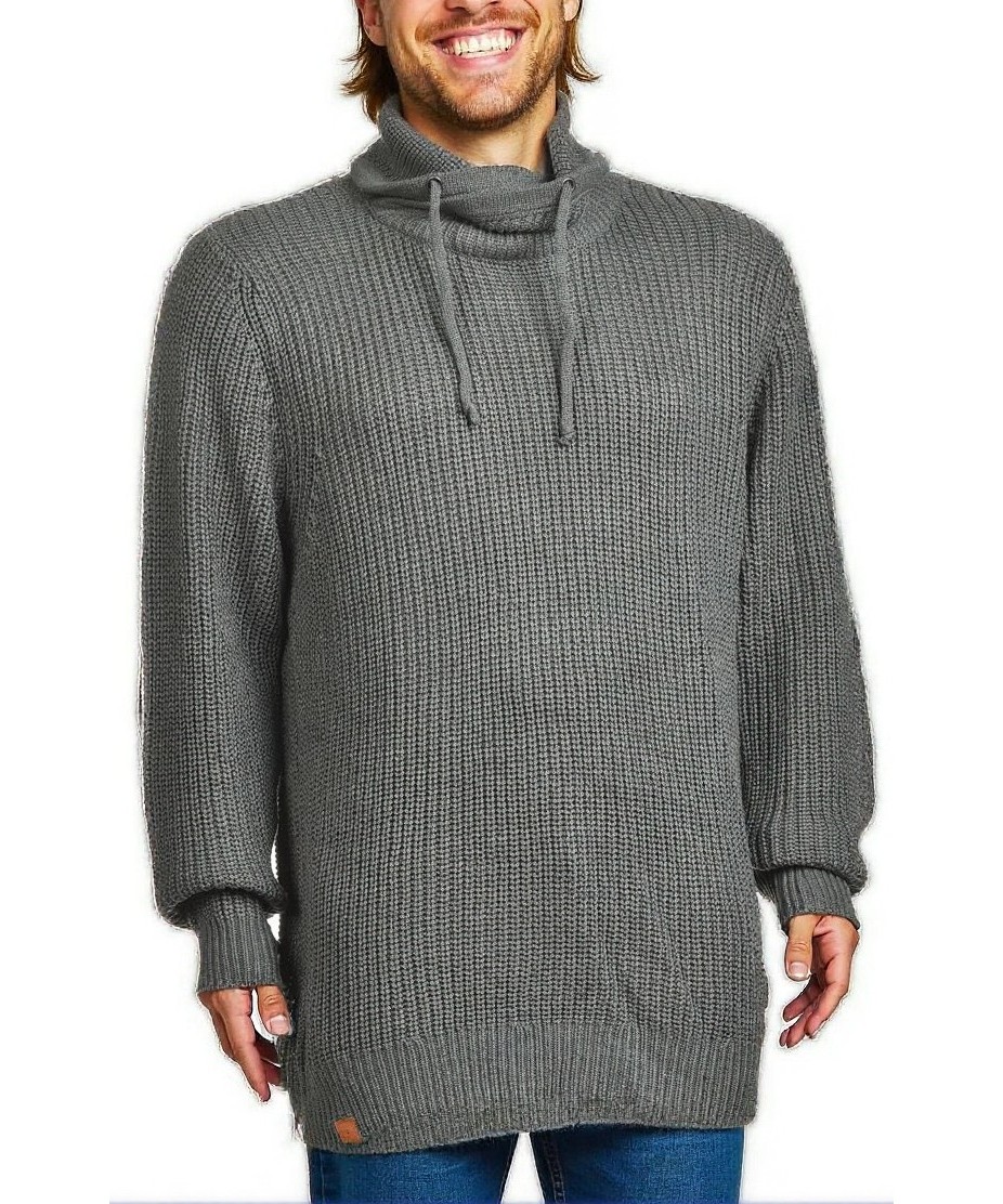 Мъжки сив плетен пуловер с висока яка с връзки, дълъг оувърсайз силует, широки ръкави и ластични маншети. Топъл и удобен, подходящ за ежедневие и зимни разходки. Идеален за зимни дни разходки и офиса.