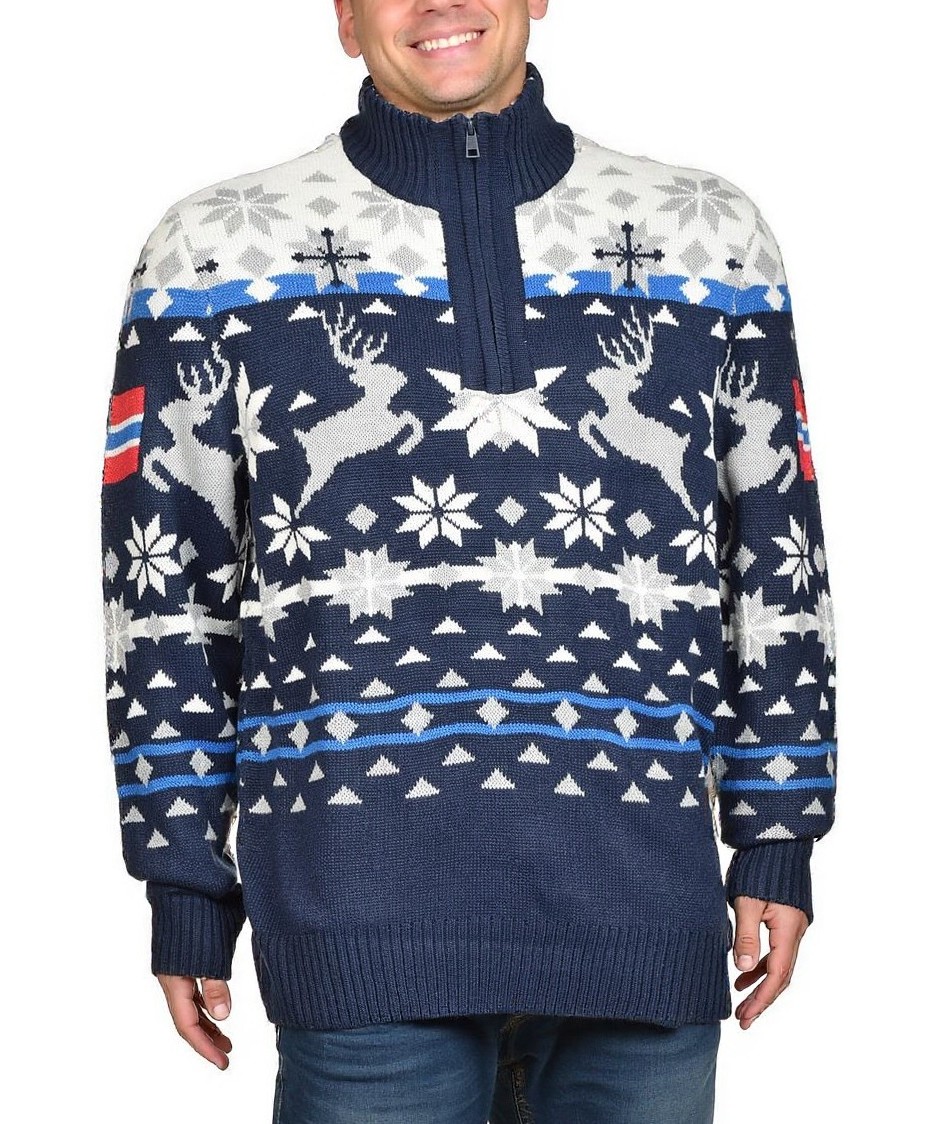 Мъжки плетен пуловер в тъмносиньо със скандинавски десен с елени и снежинки. Висока яка с цип, рипсени маншети и подгъв, топъл и удобен за зимни разходки и ежедневна употреба. Подходящ за подарък. Ново!!