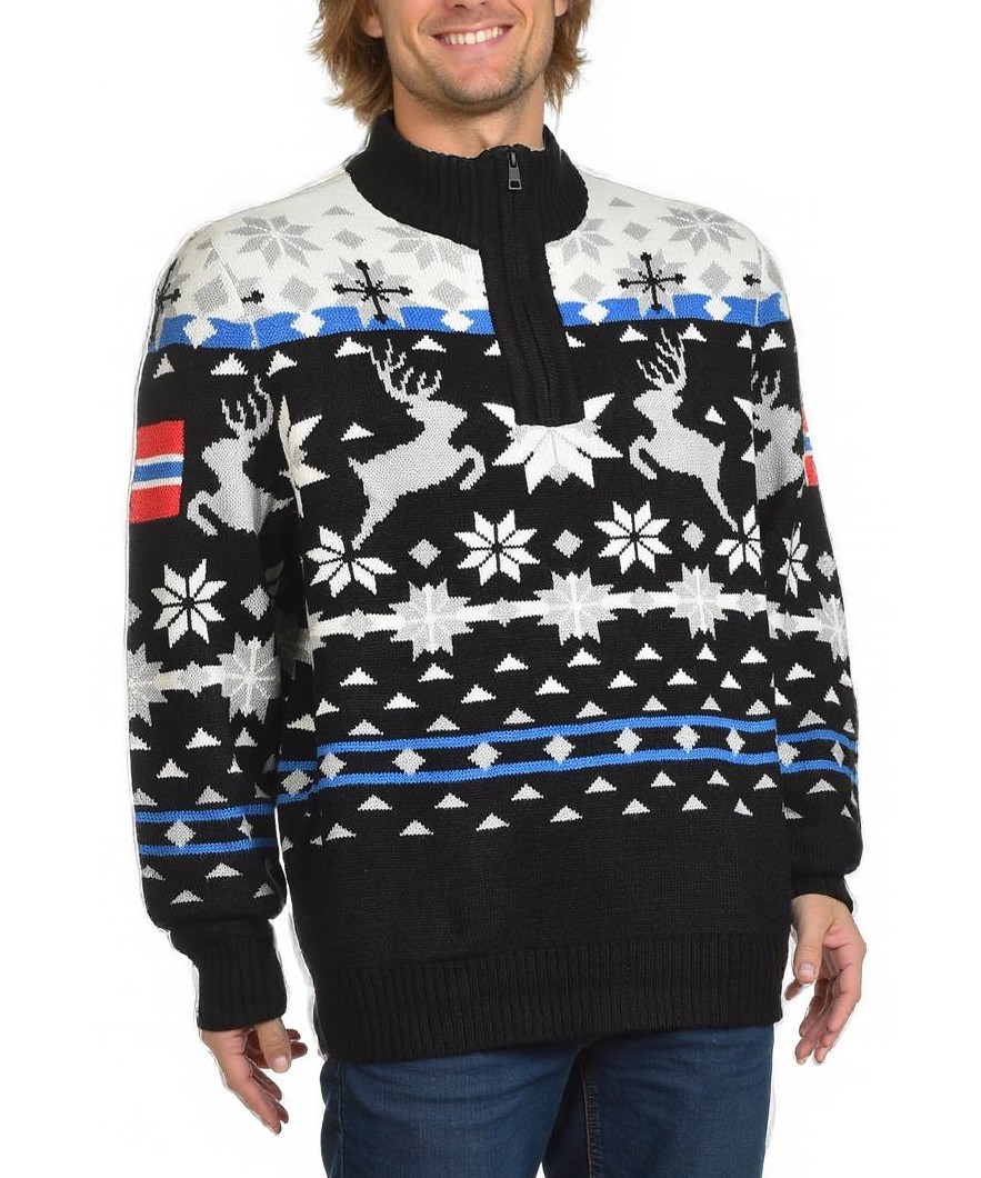 Мъжки плетен пуловер с норвежки мотиви в черно, бяло и синьо. Полу-цип, висока яка и рипсовани маншети. Топъл и удобен за зимата, подходящ за всеки ден. Лека материя, висока яка и стилен зимен акцент.
