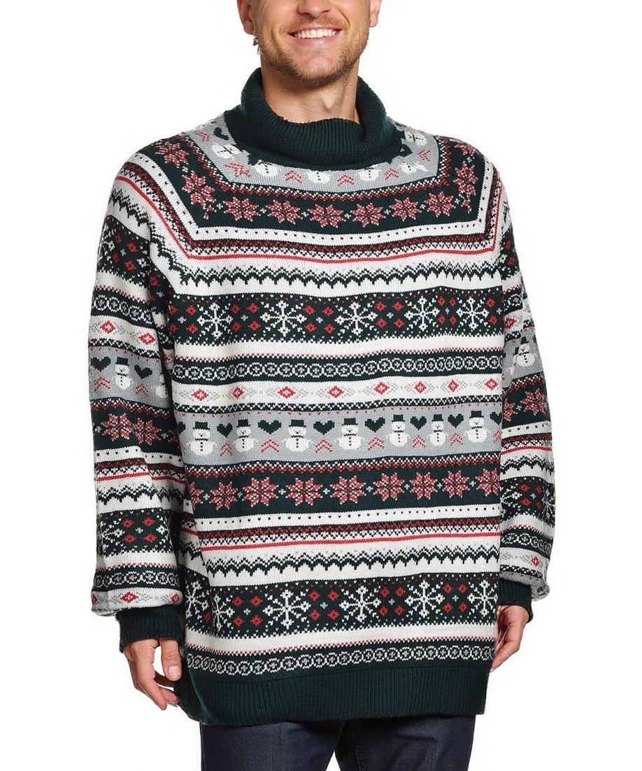 Мъжки зимен пуловер с фейър айс мотиви в тъмно зелено, бяло и червено. Висока яка, дълъг ръкав и плътно плетиво — топъл и стилен за празници и всеки ден.