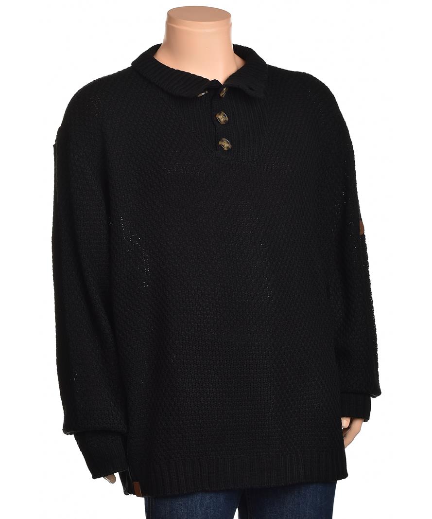 Мъжки черен плетен пуловер с поло яка и три копчета. Релефна плетка, ръкави и подгъв с ластик, свободна кройка. Топъл, удобен и подходящ за ежедневно носене и уикенд.
