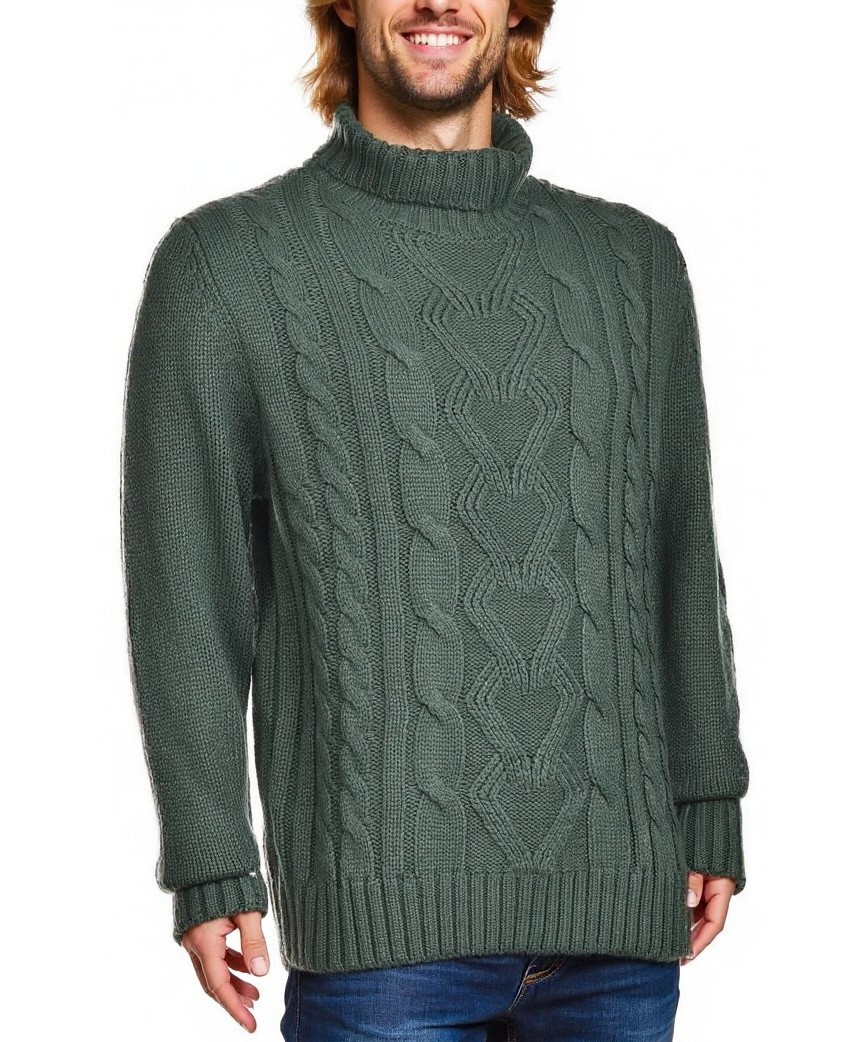 Мъжки пуловер в тъмнозелено, плетен с релефни плитки и висока поло яка. Дебела, мека вълнена материя, със стегнати ластични маншети и подгъв. Топъл, удобен модел за есен/зима и ежедневие. Стилен избор