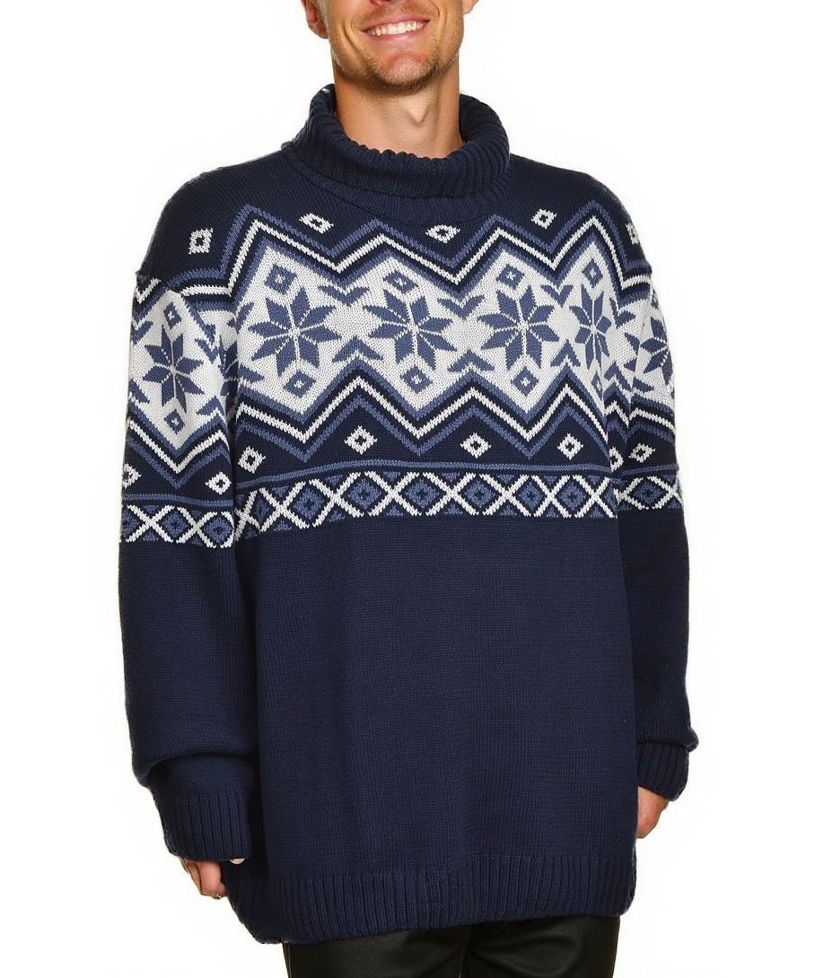 Мъжки памучен пуловер в тъмносиньо с бели и светлосни орнаменти в норвежки стил. Висока поло яка, дълги ръкави, рипсен подгъв и маншети. Топъл, удобен и стилен за всеки ден. Подходящ за подарък. днес!