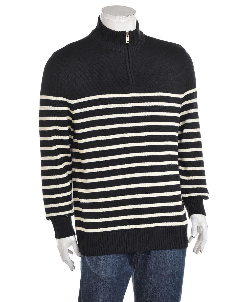 Мъжки памучен пуловер с класическа морска райе шарка в тъмносиньо и бяло. Половин цип, висока рипсова яка, рипсова лента на ръкавите и долната част. Удобен, топъл и стилен за ежедневие. Стилен избор.!