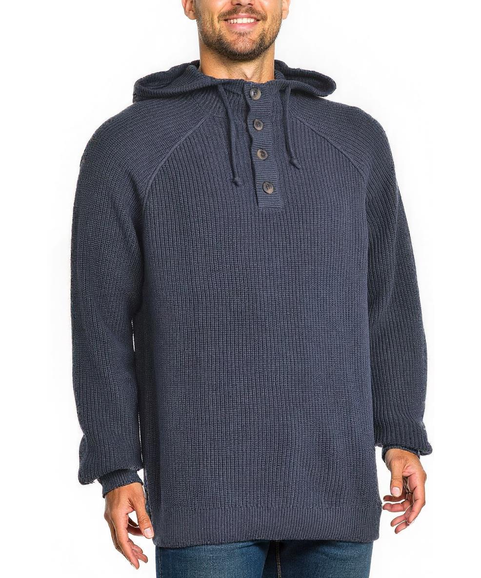 Мъжки памучен пуловер с качулка и четири копчета на деколтето. Рипсова плетка, еластични маншети и долна лента, свободна кройка, топъл и дишащ, идеален за ежедневие и преходни сезони. За всеки ден