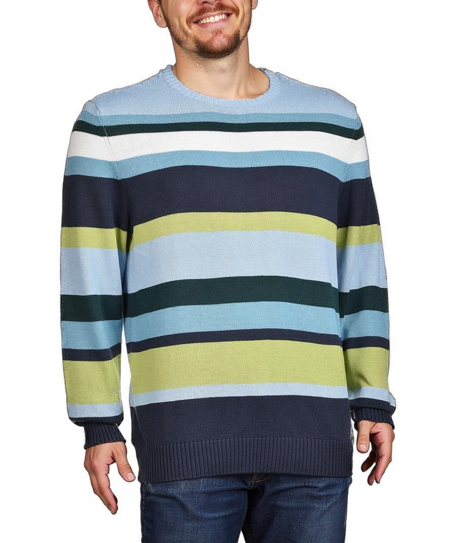 Мъжки памучен пуловер с кръгло деколте и модерни хоризонтални райета в сини и зелени тонове. Мек, дишащ и удобен за ежедневно носене. Лесна поддръжка и класически силует. Наличен в различни размери. Удобен