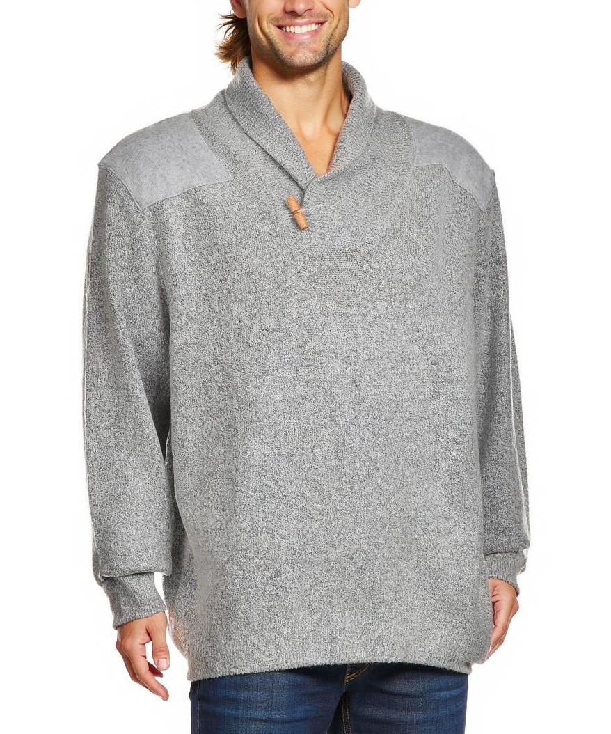 Сив мъжки пуловер с леко рибено плетиво, шалова яка и декоративно копче. Свободна кройка, мека и топла материя, подходящ за ежедневие и студено време. Комбинира се с дънки и боти. В наличност S M L XL