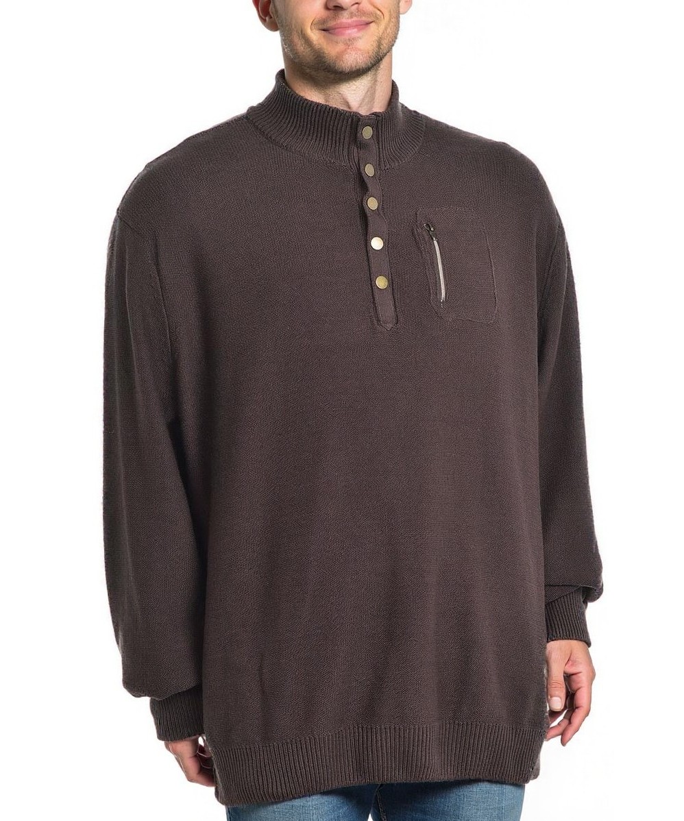 Мъжки памучен пуловер в тъмнокафяво с прав силует, висока рипсена яка и планка с четири копчета. Има малък джоб с цип на гърдите, еластични маншети и долна част. Удобен и дишащ за всеки ден. Приятен.