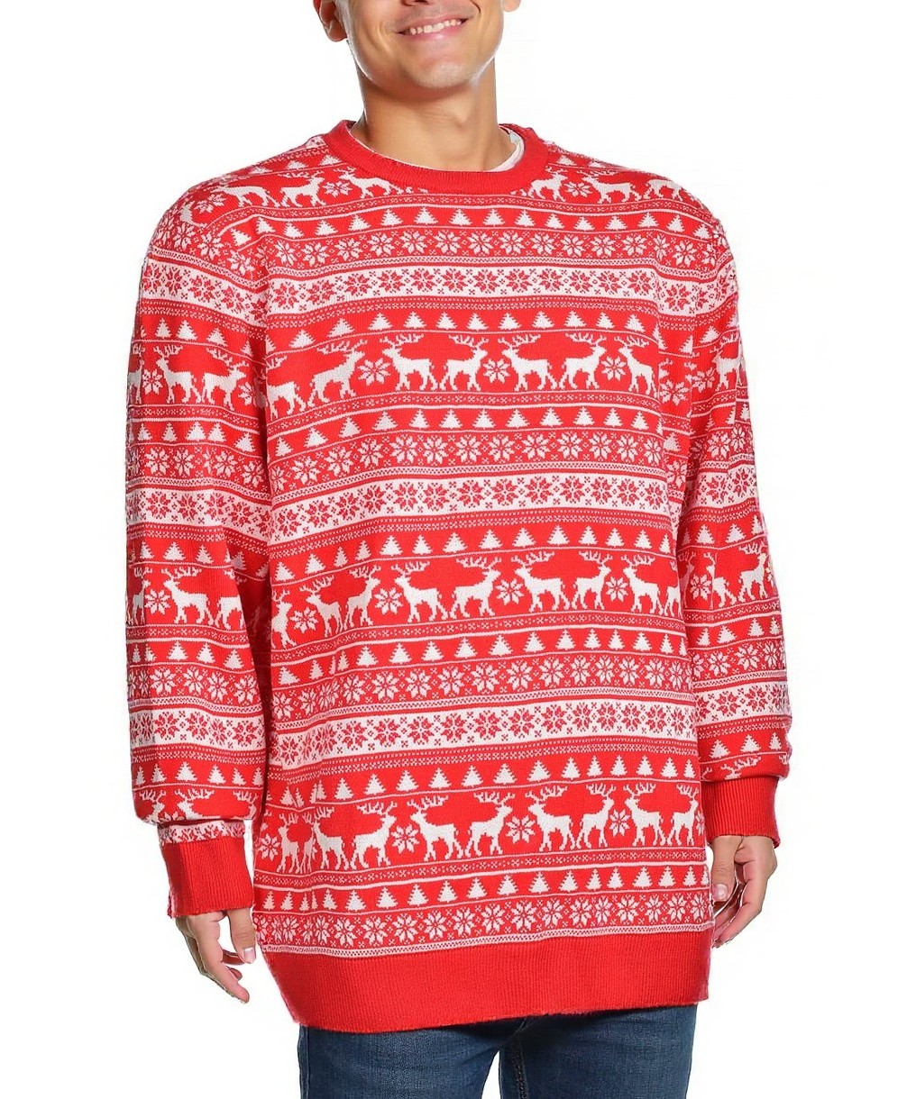 Мъжки зимен пуловер в ярко червено с бели коледни орнаменти — сърни, снежинки и елхички. Удобна кройка, мек плетен плат, еластични ръкави и подгъв. Идеален за празнични дни. Топъл и стилен избор. XXL.