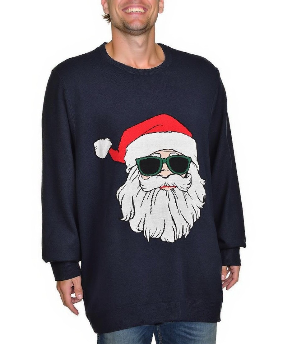 Мъжки пуловер тъмносин с коледен принт: Дядо Коледа със слънчеви очила. Мек, топъл и удобен, с дълги ръкави и кръгло деколте — идеален за празнични и ежедневни визии. Лесна поддръжка, идеален подарък.