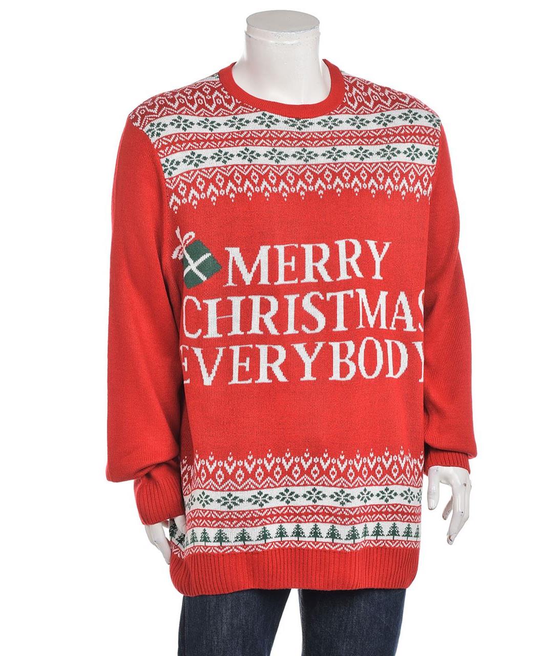 Мъжки коледен пуловер в ярко червено с надпис "Merry Christmas Everybody", традиционни снежинки и елхови мотиви, кръгло деколте и дълги ръкави. Топъл, удобен и празничен избор. Подходящ за подарък!!