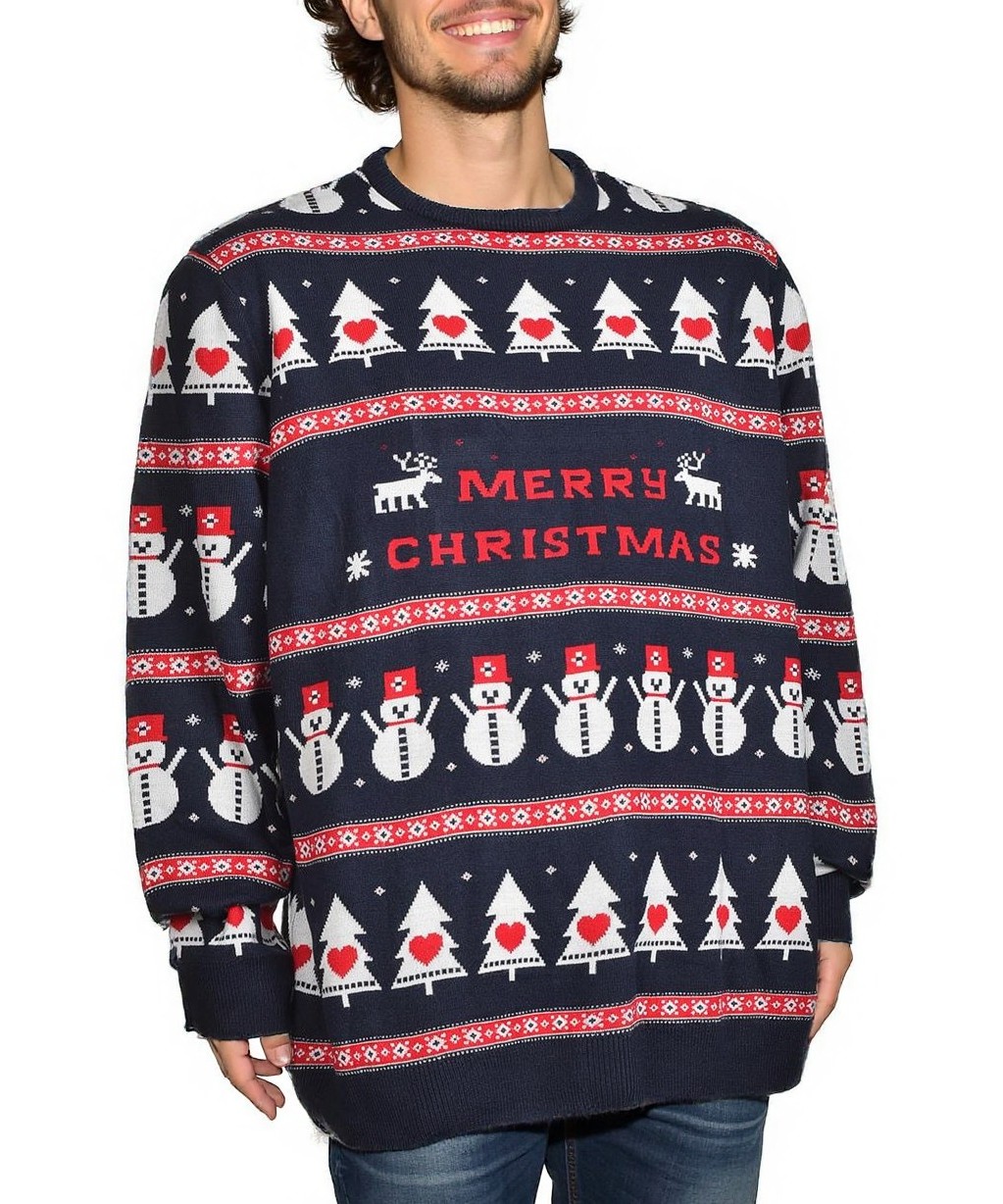 Мъжки коледен пуловер в тъмносиньо с червени и бели мотиви: снежни човеци, елхи със сърца и надпис 'Merry Christmas'. Удобен, плетен, с рипсена яка и маншети — стилен и топъл за празниците. Много уютен