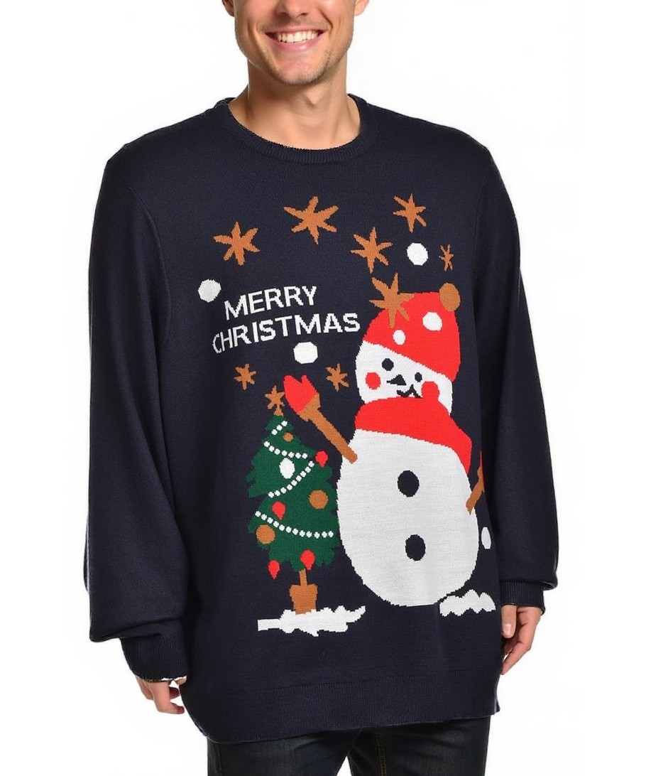 Мъжки коледен пуловер в тъмносин цвят с весела щампа на снежен човек и елха, надпис MERRY CHRISTMAS. Уютен, свободна кройка, дълги ръкави — перфектен за празнични вечери и подарък. Стилен и практичен.