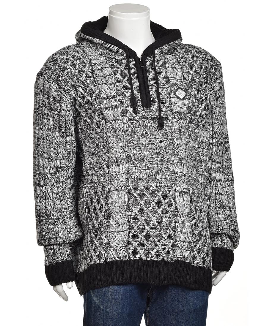 Мъжки плетен пуловер с качулка и цип, двуцветен меланж в сиво и черно. Топъл, с релефен плитъчен десен, джоб кенгуру, ластични ръкави и долна част. Идеален за ежедневие и студено време. Уютен и стилен.