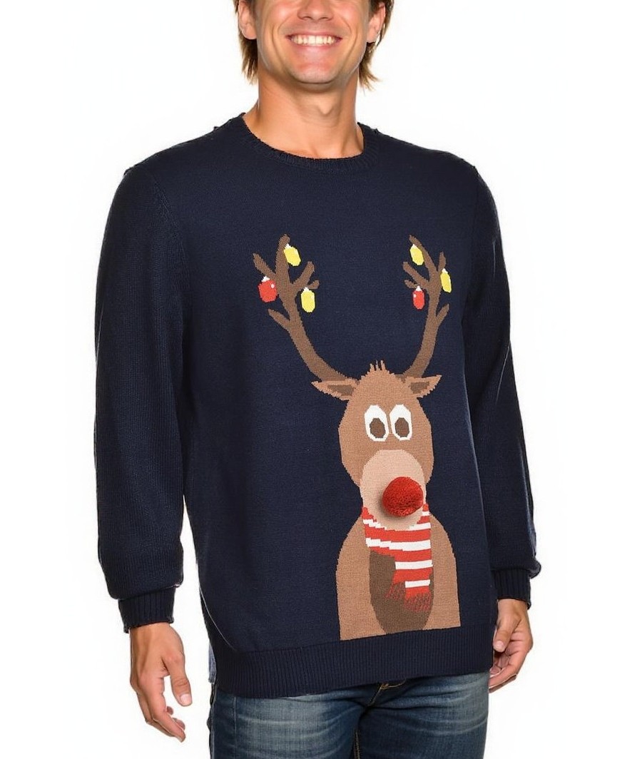 Мъжки пуловер тъмносин с коледен елен и червен помпон на носа, с шарен шал. Топъл, мек плетен дизайн с рипсен подгъв и маншети, удобен избор за празници и ежедневие. Перфектен подарък, за студена зима.