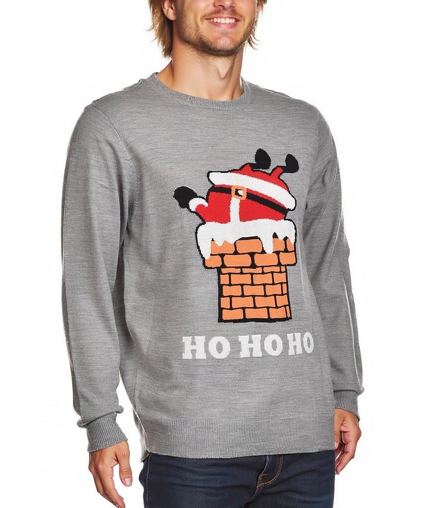 Мъжки коледен пуловер в сив цвят с весела щампа: Дядо Коледа застрял в комин и надпис HO HO HO. Удобна кройка, плетена материя и еластични ръкави и долен кант. Идеален за празничен гардероб. Стилен!!!