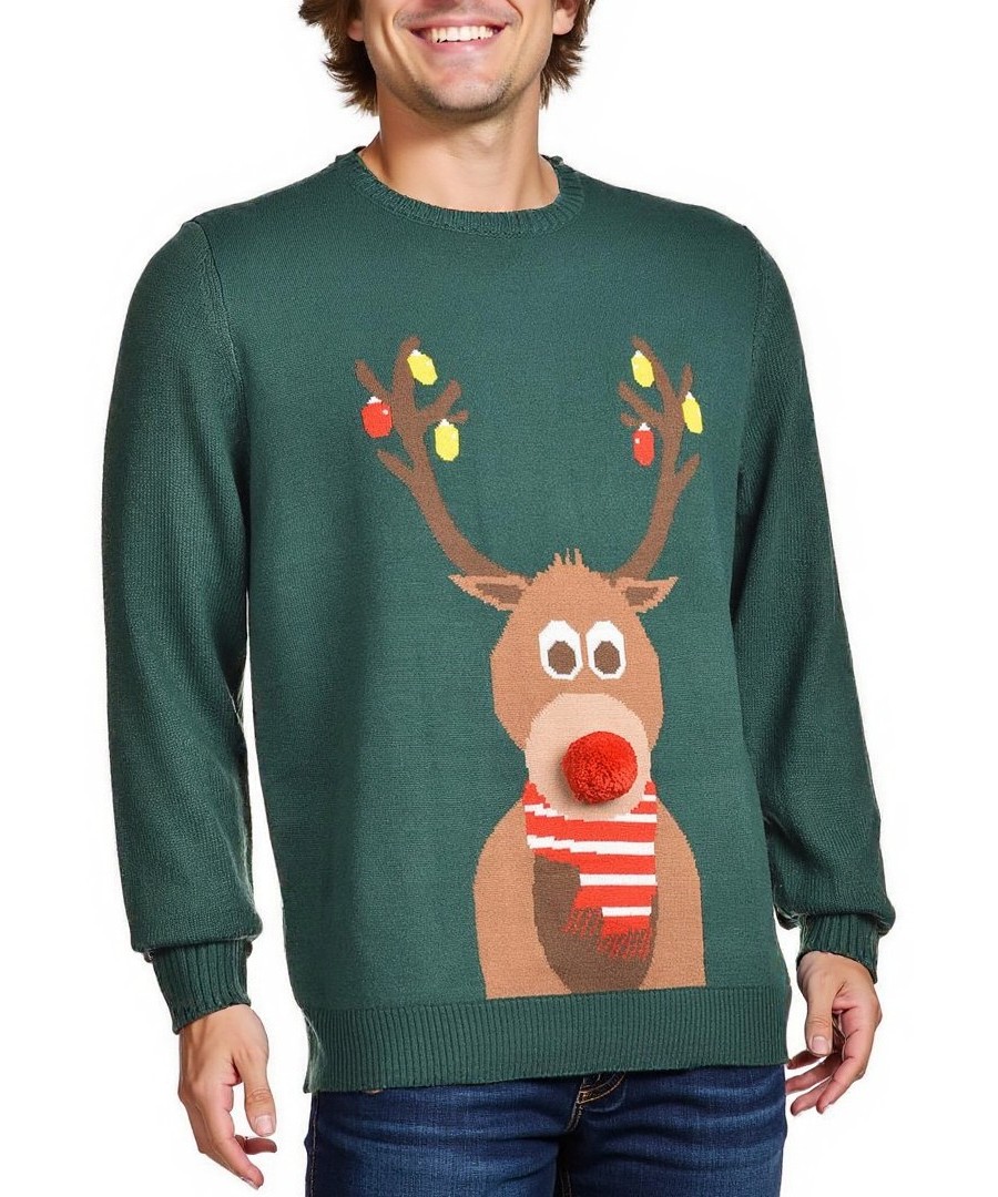 Мъжки коледен пуловер в тъмнозелен цвят с весел елен, шарен шал и помпон за нос. Мека плетка, класическо кройка, подходящ за празнични събирания и подарък. Удобен силует, лесна поддръжка и стил. Зашит.