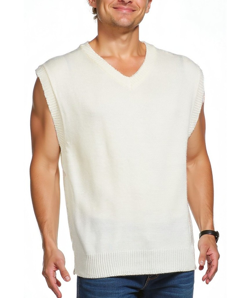 Мъжки безръкав пуловер в бял цвят с V-образно деколте и фино плетиво. Ребрист кант, удобна кройка, стилен и универсален модел за слоево обличане с риза или тениска в ежедневни и офис визии. Размери M-XXL..