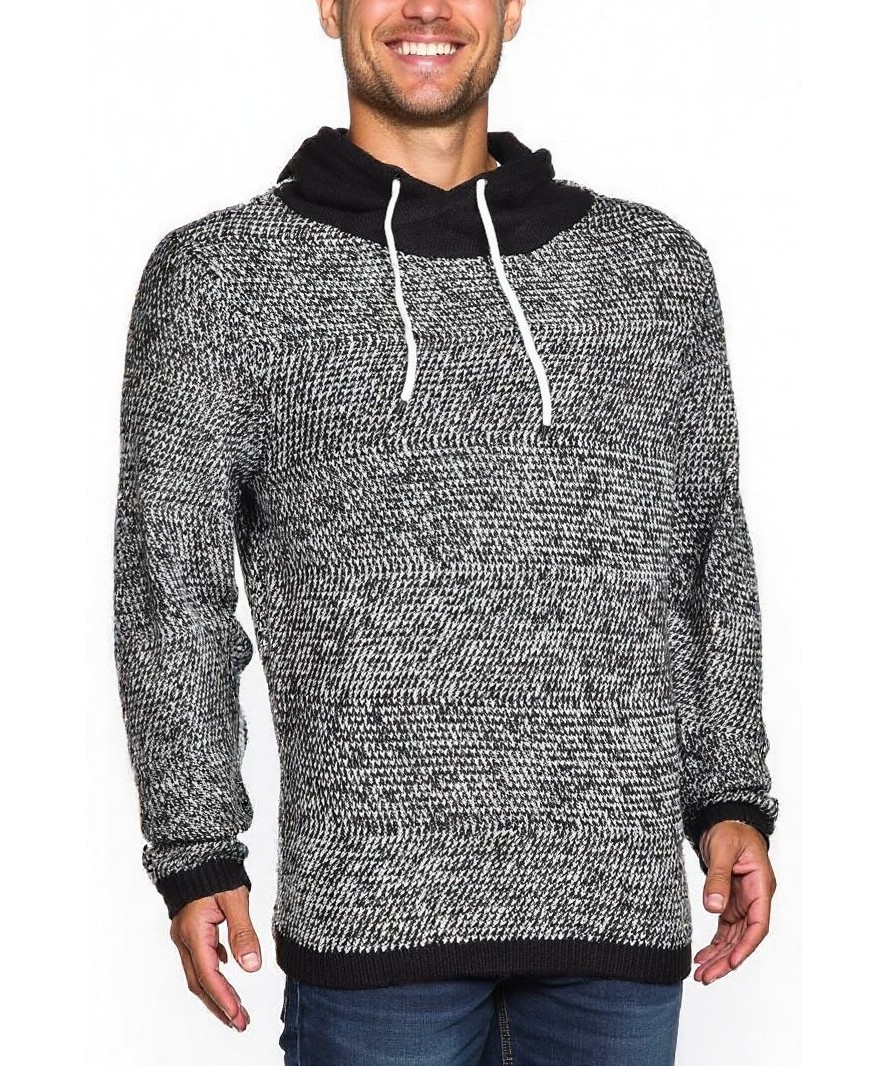 Мъжки пуловер в меланжов черно-бял десен с удобна качулка и бели връзки. Плътна плетка, дълги ръкави и ластични маншети за по-добро прилягане. Идеален за ежедневно носене. Отличен избор за студените дни!