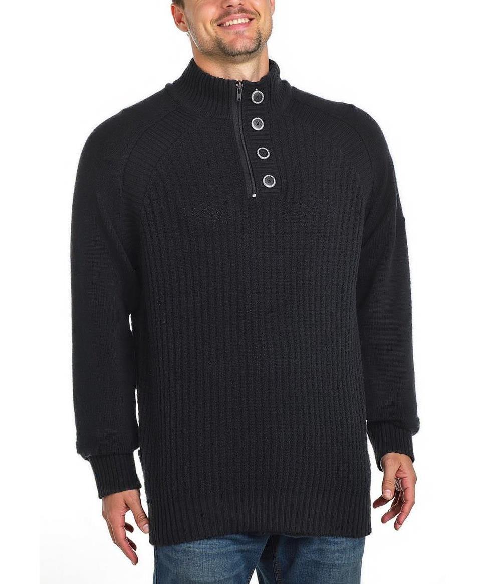Мъжки памучен пуловер в черно с рипсен плетен пред и гладък гръб. Висока яка с цип и декоративни копчета, дълги ръкави, комфортна свободна кройка. Дишащ и подходящ за ежедневно носене. Лек и удобен.