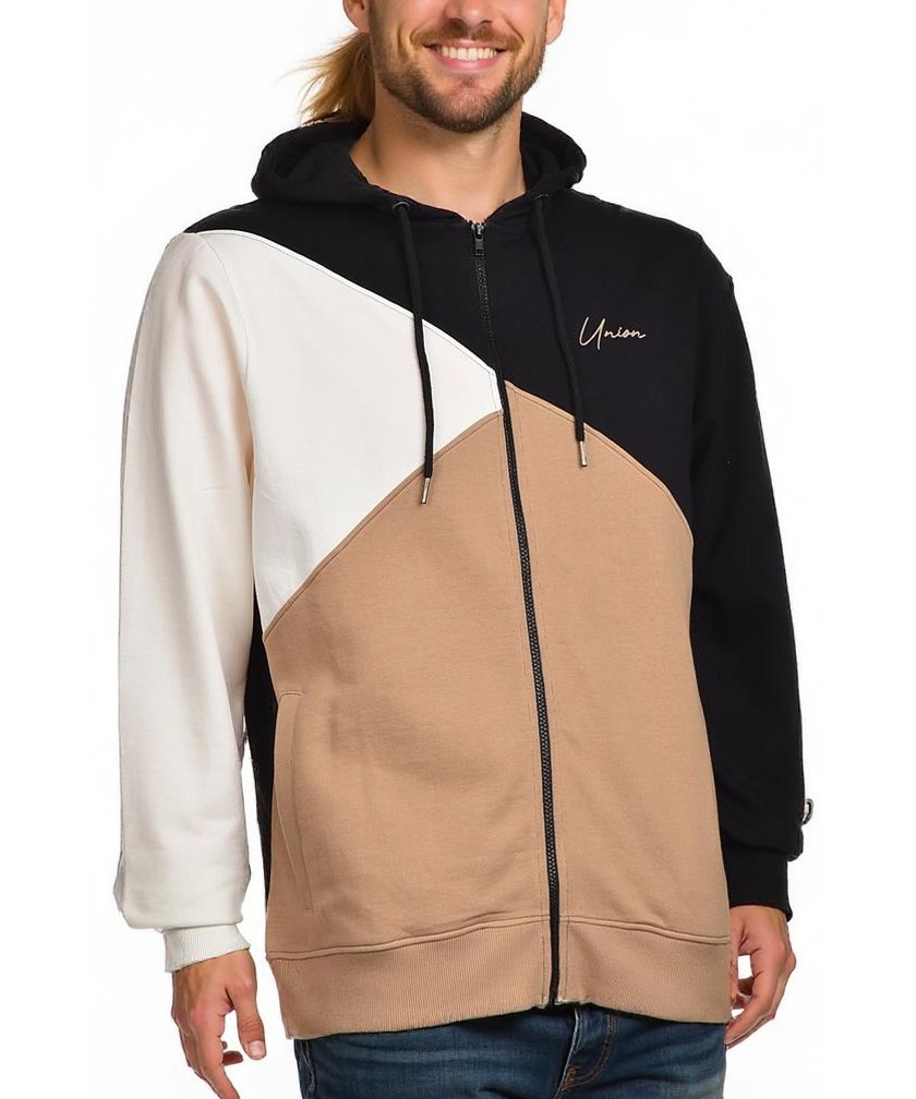 Мъжки памучен суичър с качулка и цип, модерен трицветен дизайн в черно, бежово и бяло. Удобен памук, джобове и ластични маншети — топъл и за ежедневно носене. Лек, диша и запазва формата след пране стил.