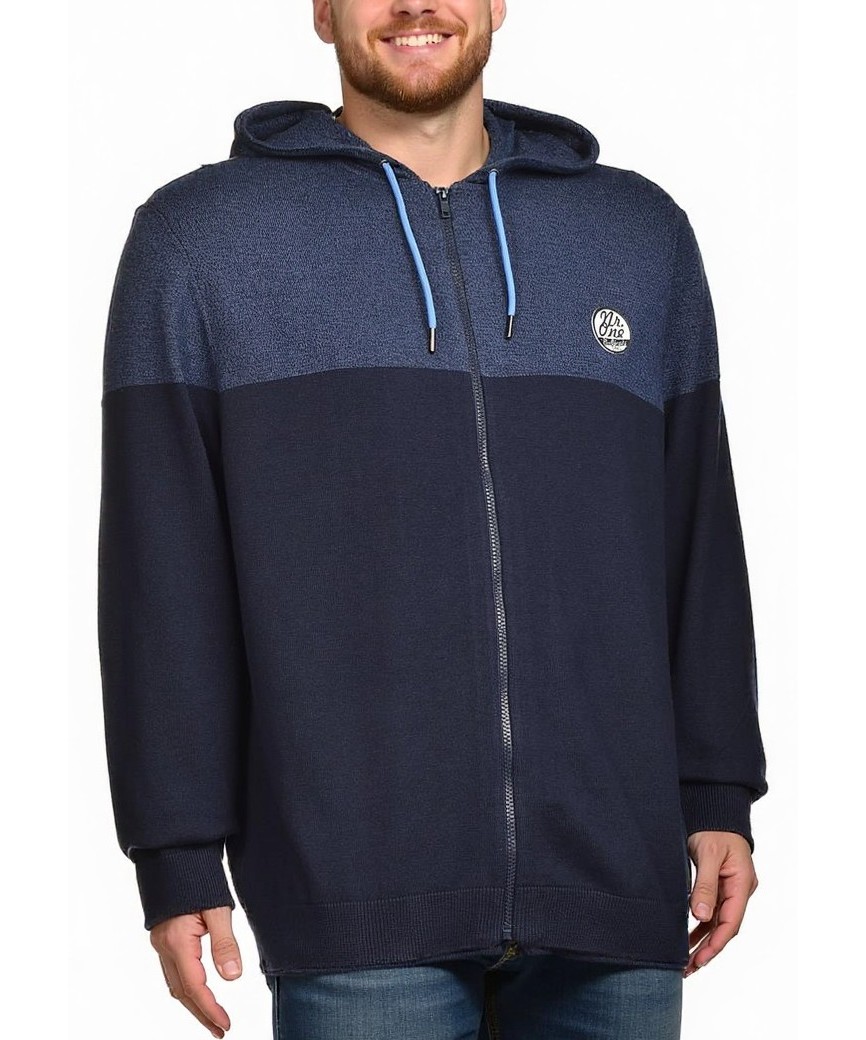 Мъжко памучно горнище с качулка и цип, в тъмносиньо с контрастен горен панел. Удобно и дишащо, с регулиращи връзки, рипсени маншети и ежедневно спортно-елегантно излъчване. Идеално за всеки ден и спорт