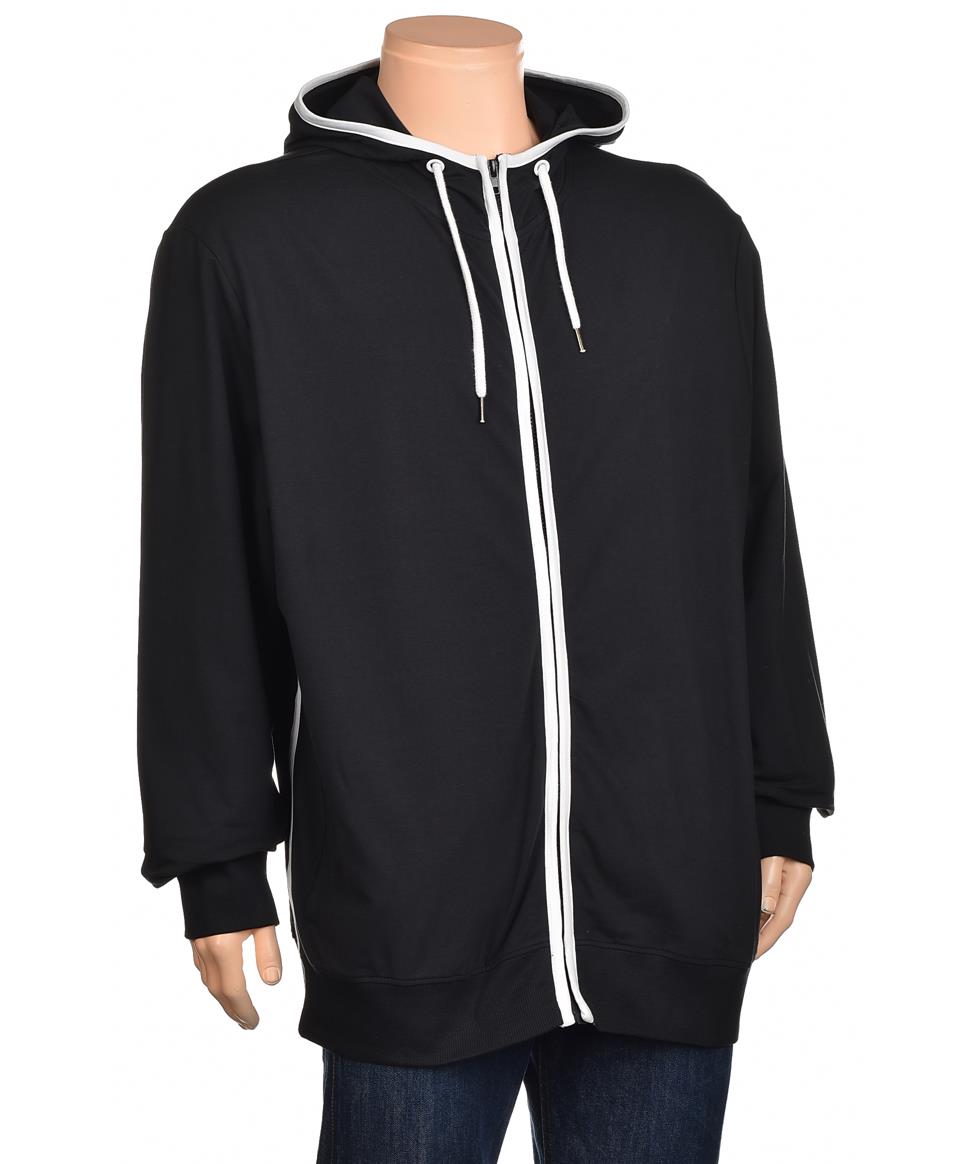 Мъжко горнище от памук. Черно, с качулка и цял цип, контрастни бели кантове и връзки. Мека и дишаща материя, удобна права кройка, маншети и странични джобове. Идеално за всеки ден. Удобен и практичен.