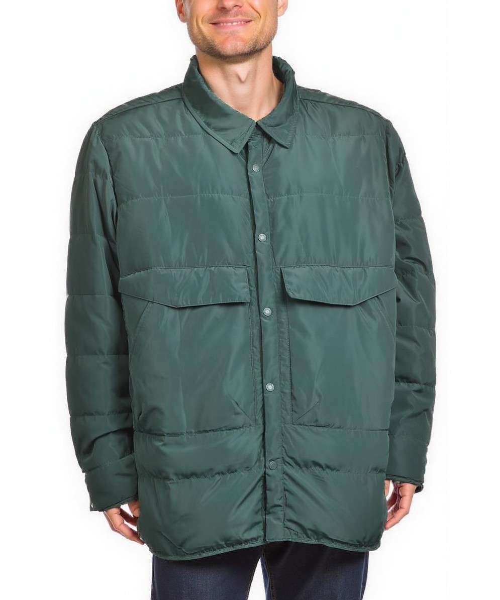 Мъжко яке в тъмнозелен цвят, пухено и топло, с прав силует и класическа яка. Закопчава се с копчета, има два големи джоба с капаци. Подходящо за ежедневие и студено време. Стилен и лесен за поддръжка.