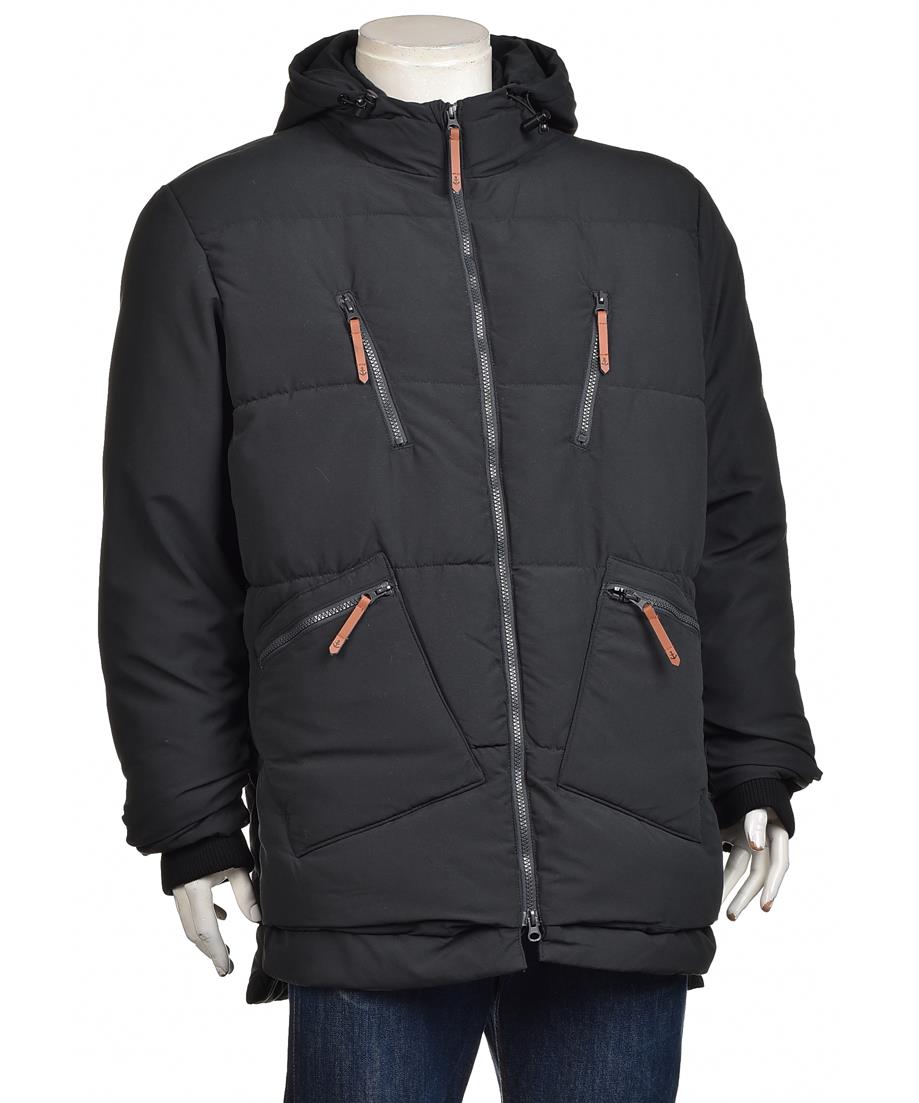 Мъжко ватирано яке в черен цвят с качулка и два предни джоба с цип. Топло, водоотблъскващо покритие, практичен дизайн за ежедневие и студено време. Модерен, удобен силует. Подходящ за град и пътуване.