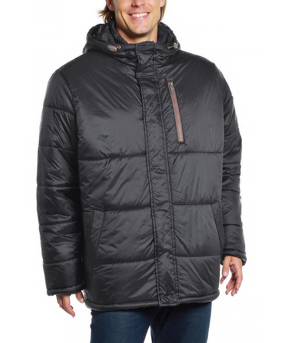 Топло ватирано мъжко яке в тъмен цвят с качулка, хоризонтални квадратирани шевове, функционален цип и външен джоб на гърдите, странични джобове и класическа права кройка за студено време. Универсално!