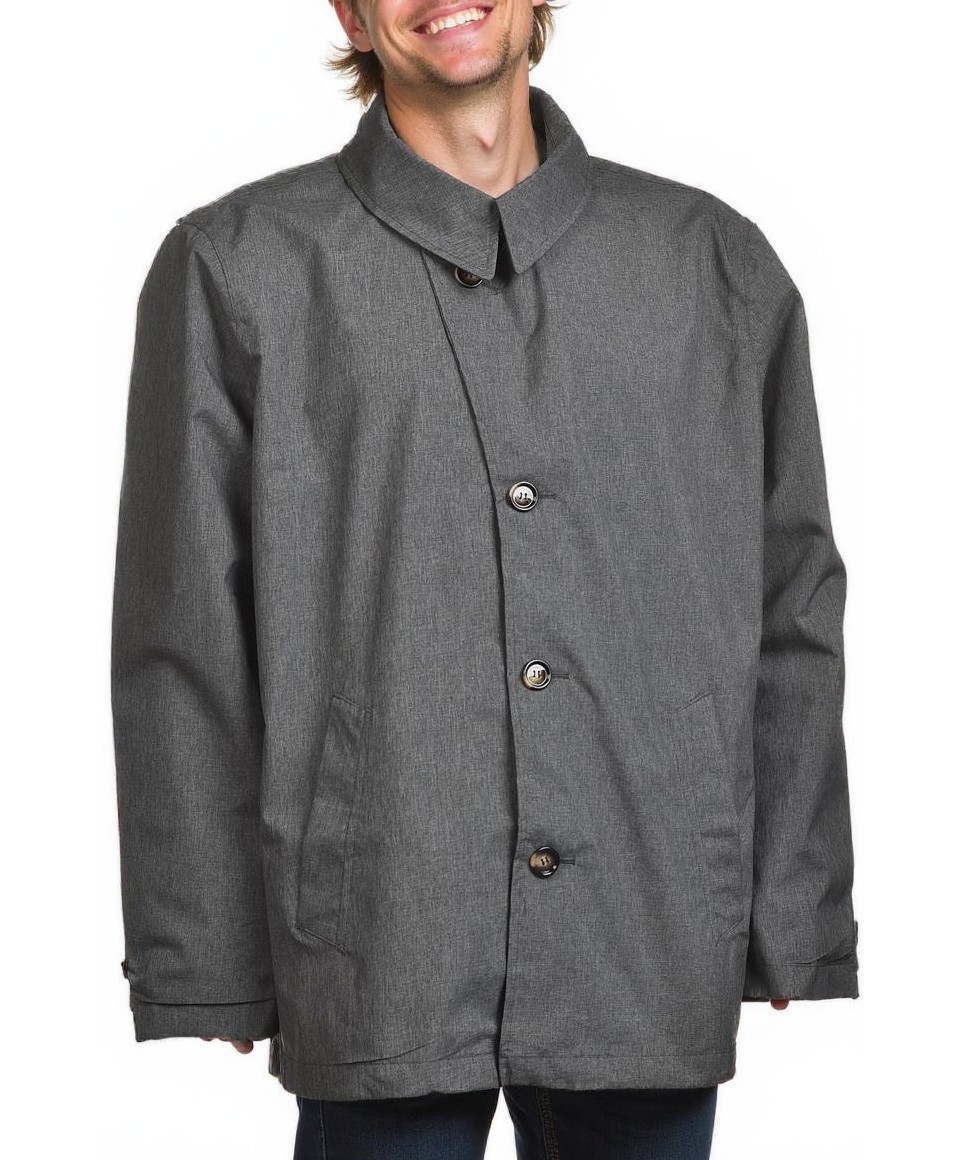 Сиво мъжко яке с изчистен, елегантен дизайн. Прав силует, затваряне с копчета, висока яка, два предни джоба и дълги ръкави. Универсално за ежедневна и офис визия.