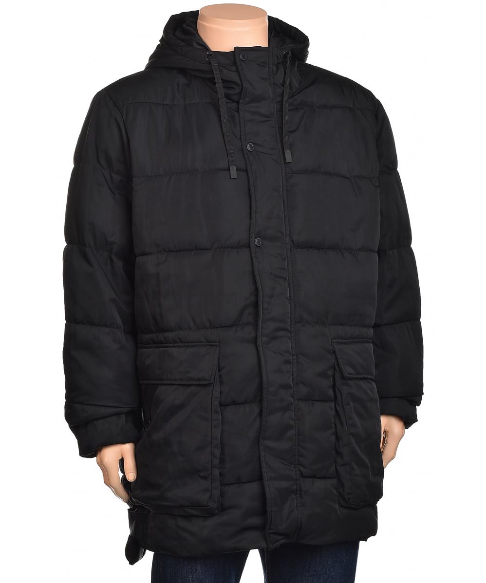 Мъжко ватирано яке в черно с качулка, дълга кройка и два големи джоба с капаци. Топло, практично и подходящо за студените зимни дни, със закопчаване на цип и копчета. Външен плат, лесен за поддръжка!!