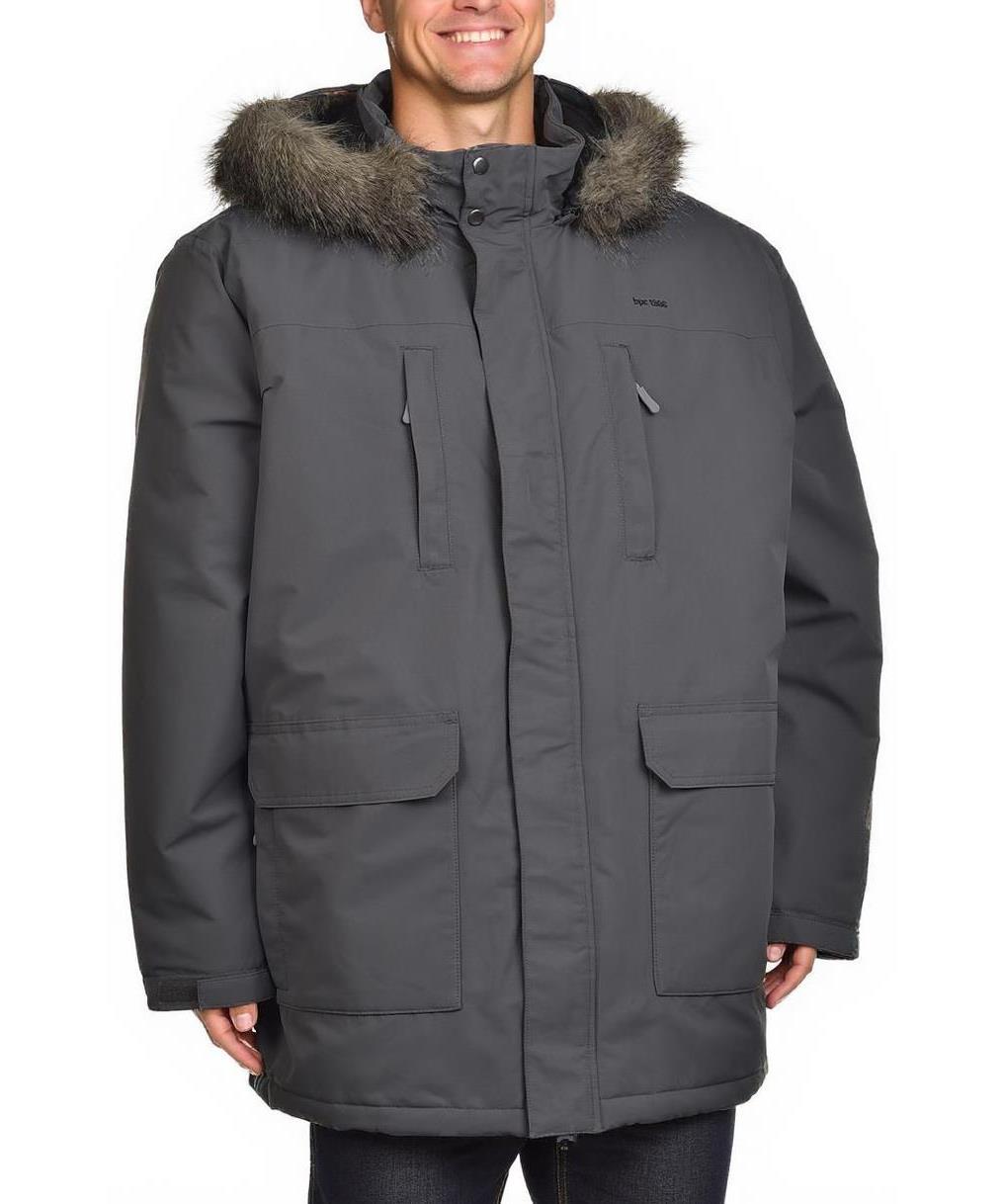 Топло мъжко зимно яке в тъмносив цвят с качулка с изкуствен пух, удължен силует и вятъронепроницаема материя. Оборудвано с два големи предни джоба с капаци и два горни джоба. Подходящо за студено време.