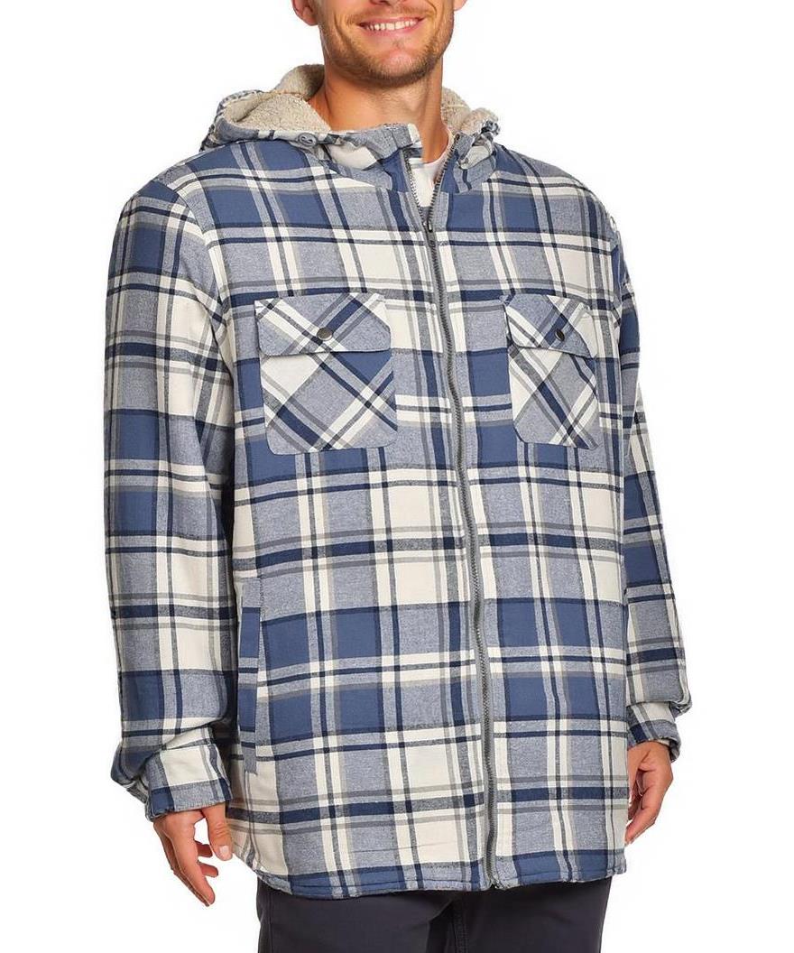 Мъжко памучно яке в синьо и бяло каре, с качулка с пухен хастар, цип отпред и два джоба с клапи на гърдите. Топло, комфортно и стилно за ежедневно носене и преходни сезони. Подходящо за студените дни.