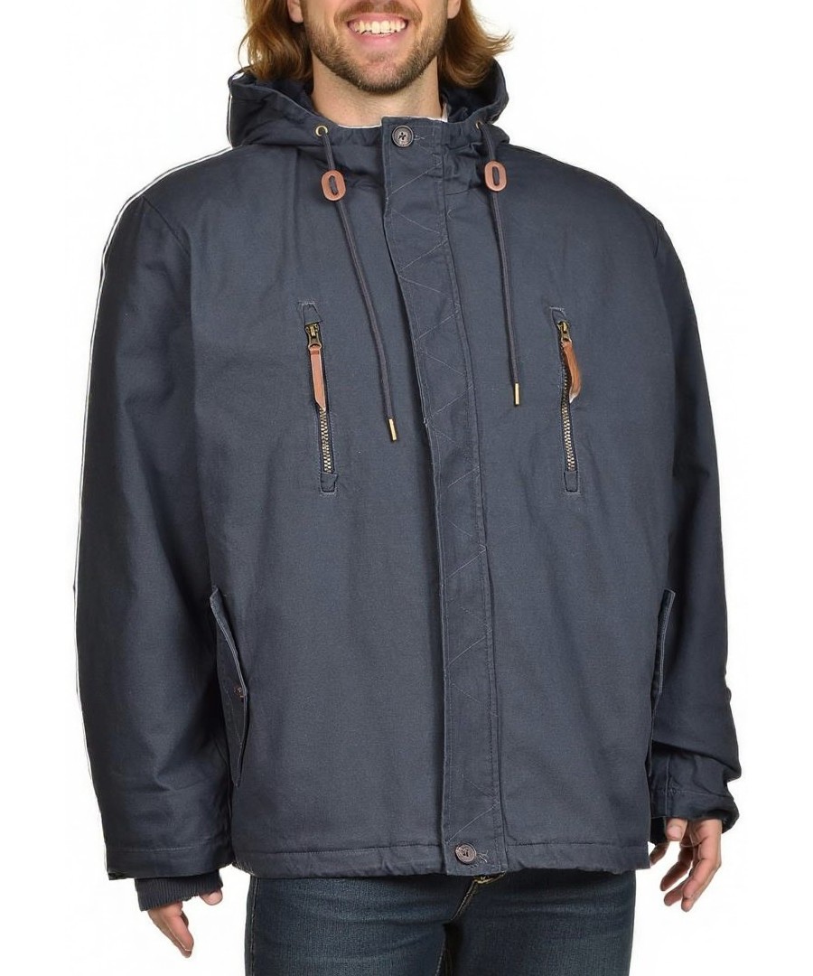Тъмносиньо мъжко памучно яке с качулка и защитен фронт с цип и капси. Практични джобове отпред, декоративни ципове на гърдите и регулируеми връзки. Удобна, леко свободна кройка. За пролет и есен. Стил.
