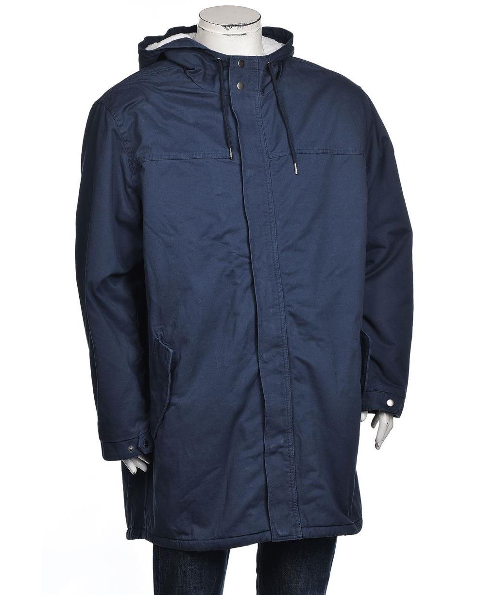 Мъжко памучно яке в тъмносиньо с качулка и практични странични джобове. Дълга, свободна кройка и предно закопчаване осигуряват комфорт и защита през преходния сезон. Лесна поддръжка и универсален стил