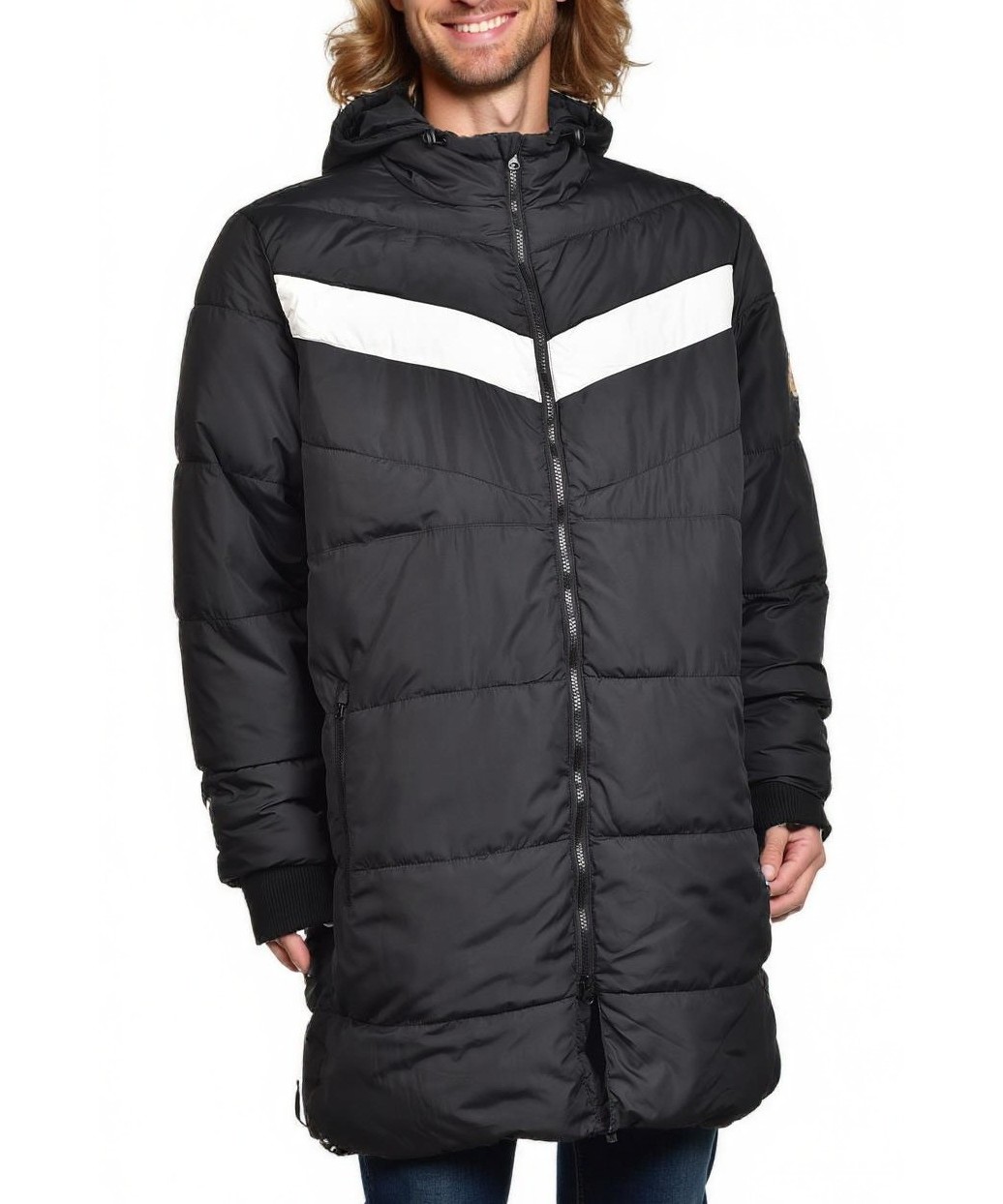 Мъжко дълго пухено яке в черно с бяла V-образна лента на гърдите. С качулка, двупосочен цип и маншети. Топло, непромокаемо и стилно за зимни разходки и ежедневие. С модерен крой и удобни джобове. 2г.
