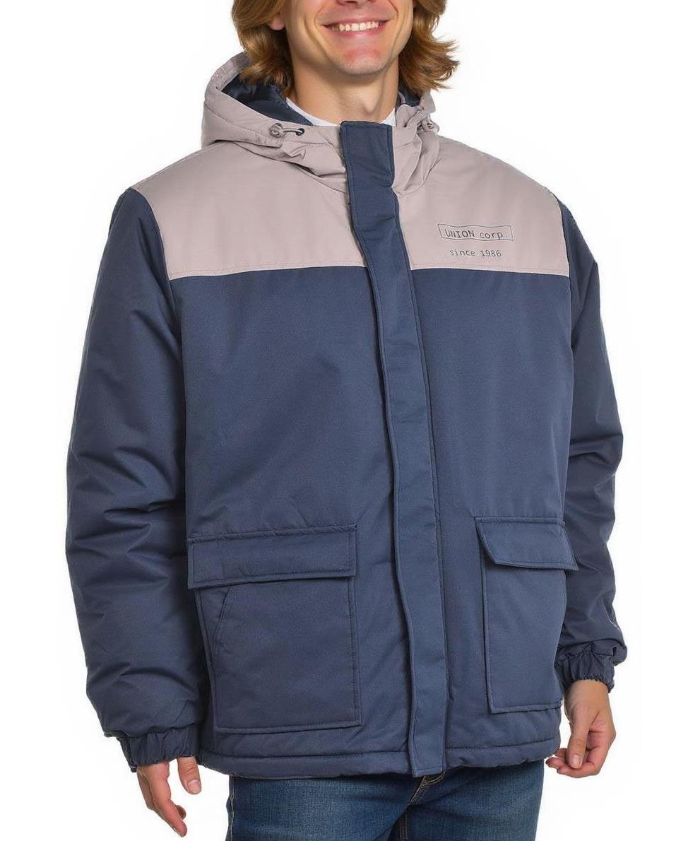 Двуцветно мъжко зимно яке в тъмносиньо и светлобежово с качулка, подплата и топла вата. Разполага с два предни джоба с капаци, цип със закопчаване, еластични маншети и удобна кройка за всеки ден. Мъж.