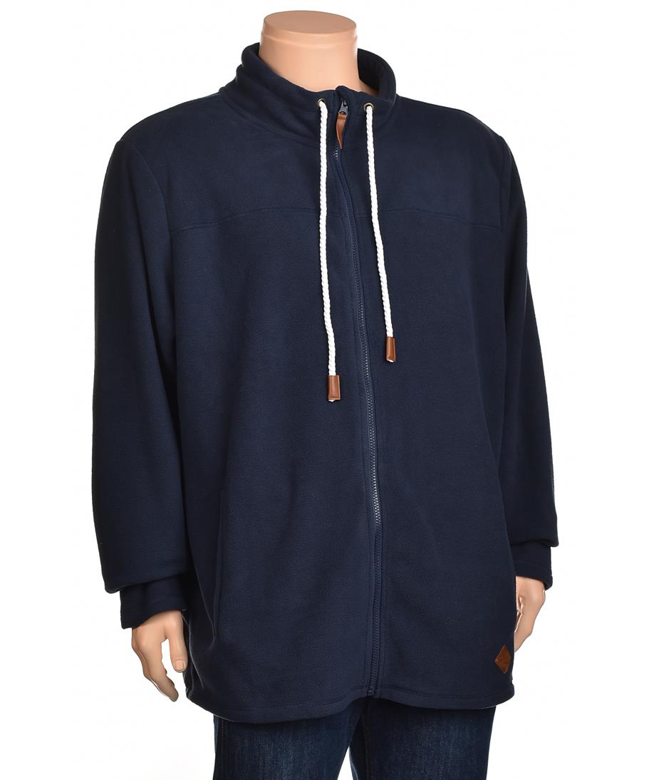 Мъжко поларено горнище тъмносиньо с цип, висока яка и регулиращ шнур, мека и топла материя, странични джобове и свободна кройка — удобно за ежедневно носене и прохладно време.