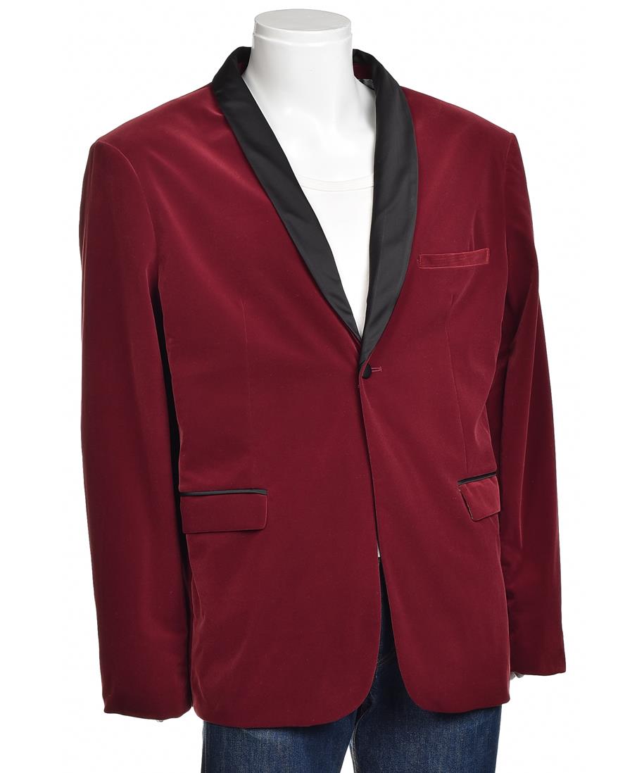 Мъжко сако в дълбок бордо велур с контрастна черна сатенена шал-яка. Елегантно, едноредно с едно копче, джобчета с клапи и съвременно прилягане за официални и полуформални събития. Стилен избор. Клас.