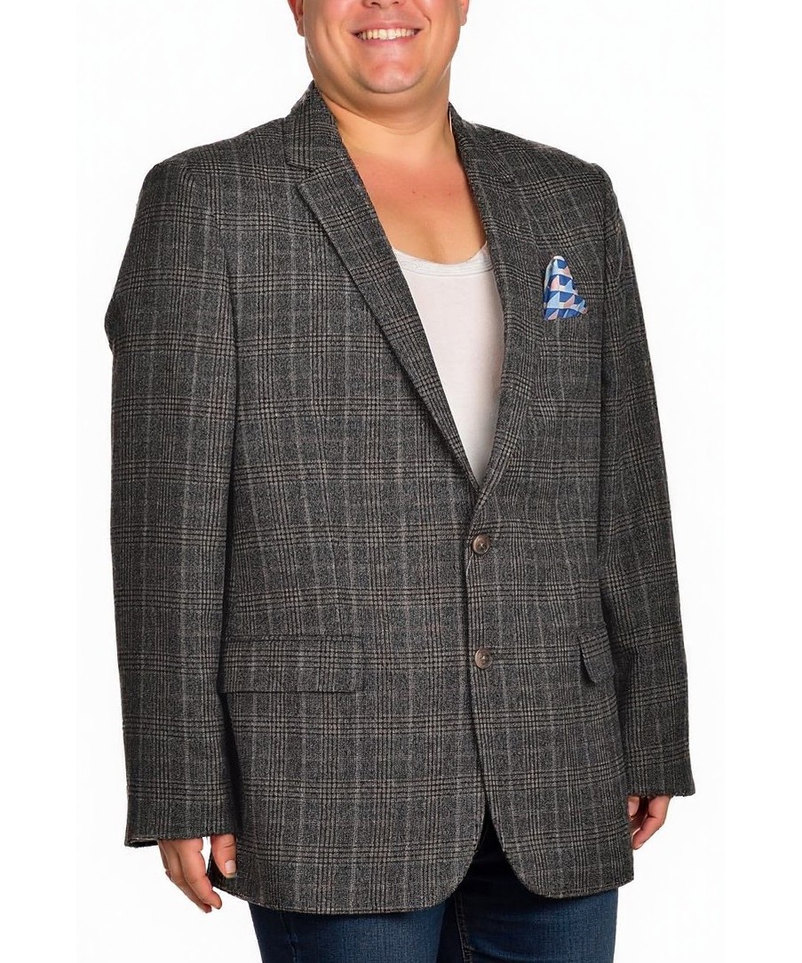 Елегантно мъжко сако от вискоза в сиво каре, двубутонно с ревер, с предни джобове с капаци и джобче за кърпичка. Меко и дишащо, идеално за офис и ежедневни визии. Лек подплатен гръб универсален силует.