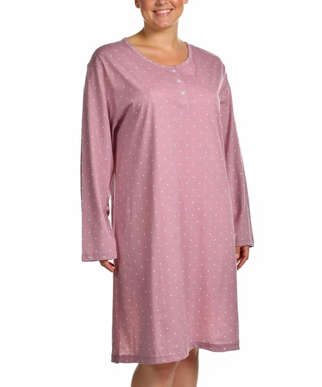 Нощница от мек 100% памук в нежен розов цвят с изчистен ситен десен. Дълъг ръкав, кръгло деколте с копченца и свободна, удобна кройка за спокоен сън и ежедневно ползване. Машинно пране, мека материя.