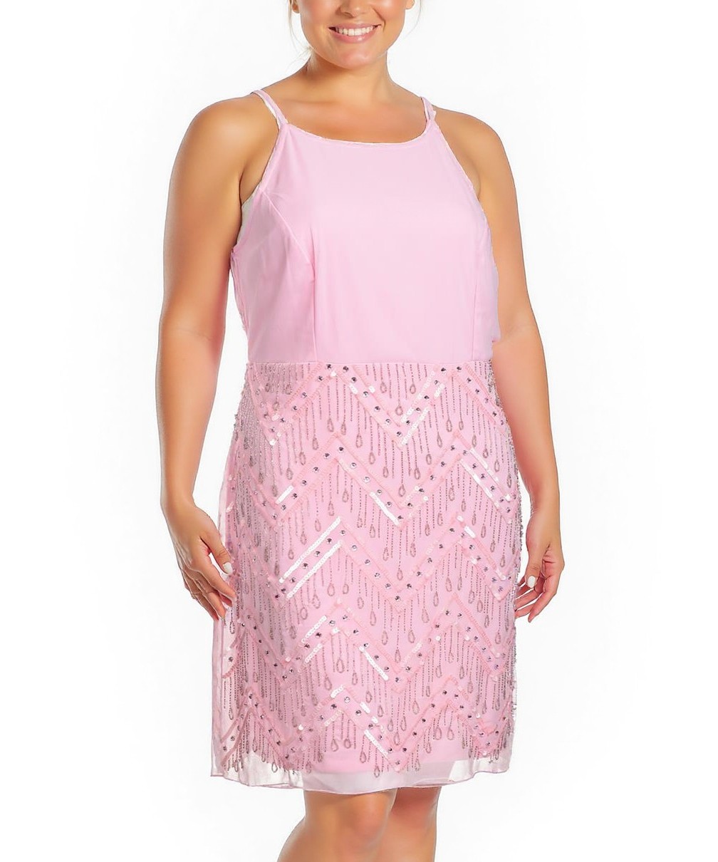 Розова официална рокля с тънки презрамки и права горна част, разкошен пайетен и перлен шевронен десен на полата. Лека подплата, до коляното, елегантна и подходяща за специални поводи. Идеална за бала.