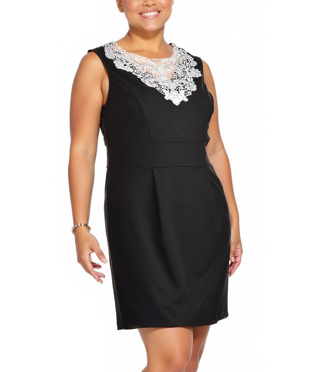 Елегантна официална рокля в класическо черно, без ръкави, до коляното. Фина вталена кройка с подчертана талия и ефектно бяло дантелено деколте. Подходяща за коктейл и официални събития. Идеална за бал