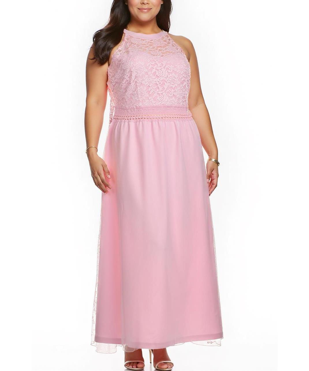 Официалната рокля е елегантна и дълга, изработена в светлорозов цвят. Горната част е с дантелена текстура и високо деколте с прозрачни детайли. Подходяща за специални събития.