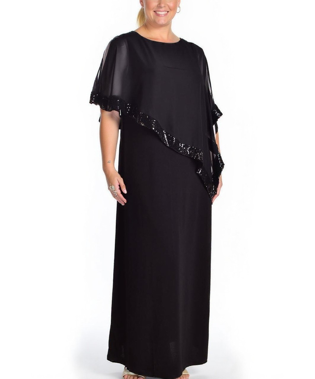 Елегантна официална дълга черна рокля с прав силует, шифонова наметка с асиметричен пад и бляскав пайетен кант. Идеална за вечерни събития, балове и официални поводи. С дискретни детайли и подплата...
