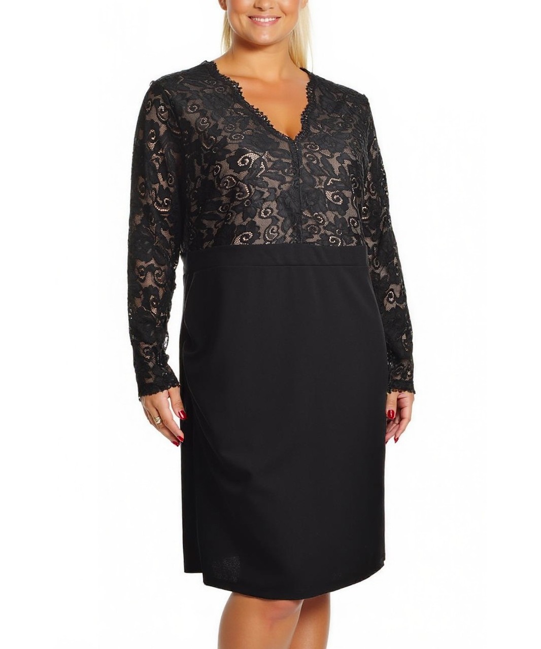 Елегантна официална черна рокля с дантелено горнище и V-образно деколте, дълги ръкави и права пола до коляното. Стилна и удобна за официални поводи, балове и коктейли. Подчертава силуета, мека материя