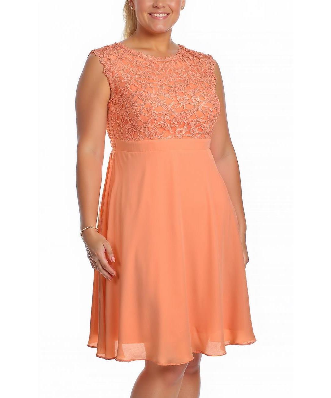 Елегантна официална рокля в прасковено-оранжев нюанс. Дантелено бюстие с фина флорална бродерия, прав крой и тънки ръкави, талията подчертана, шифонова разкроена пола до коляното — стилна и женствена.