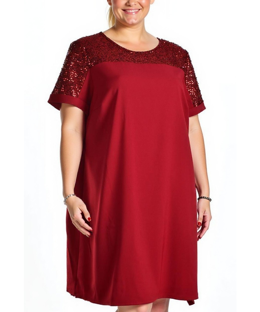 Елегантна официална рокля в дълбок бордо, разкроен силует, къс ръкав и бляскави пайети на раменете. Мека, лека материя, подходяща за тържества и официални поводи. Подходяща в големи размери и удобна!!