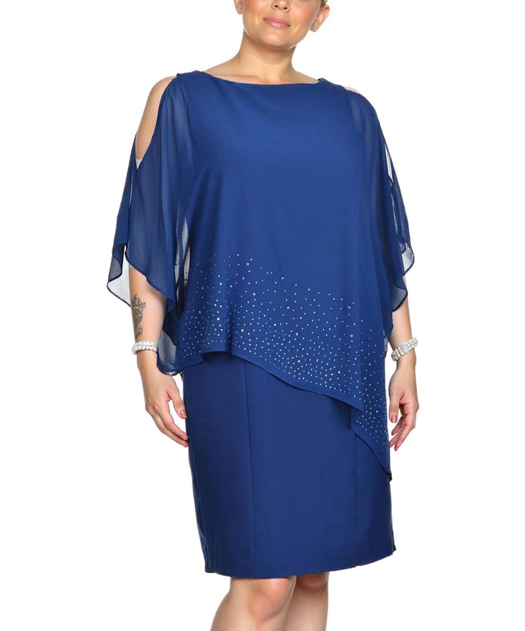 Елегантна официална рокля в син цвят с ефирен горен слой и свободна кройка. Декорирана е с малки камъчета, които придават блясък. Подходяща за специални поводи, с изискан и модерен дизайн.